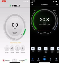 Når appen har koblet seg på sparkesykkelen din vil du få opp denne startsiden (E-Wheels appen er på venstre side og Kingsong appen på høyre side). Her får du oversikt over: