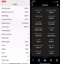 Dersom du trykker på sparkesykkel ikonet nederst i midten på startsiden (e-wheels appen) eller drar mot venstre (kingsong appen) vil du få opp en del informasjon som du kan se under: